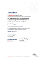 Das Informationssicherheits-Managementsystem (ISMS) der BG-Phoenics GmbH ist seit März 2020 ohne Unterbrechung nach ISO/IEC 27001 zertifiziert.
